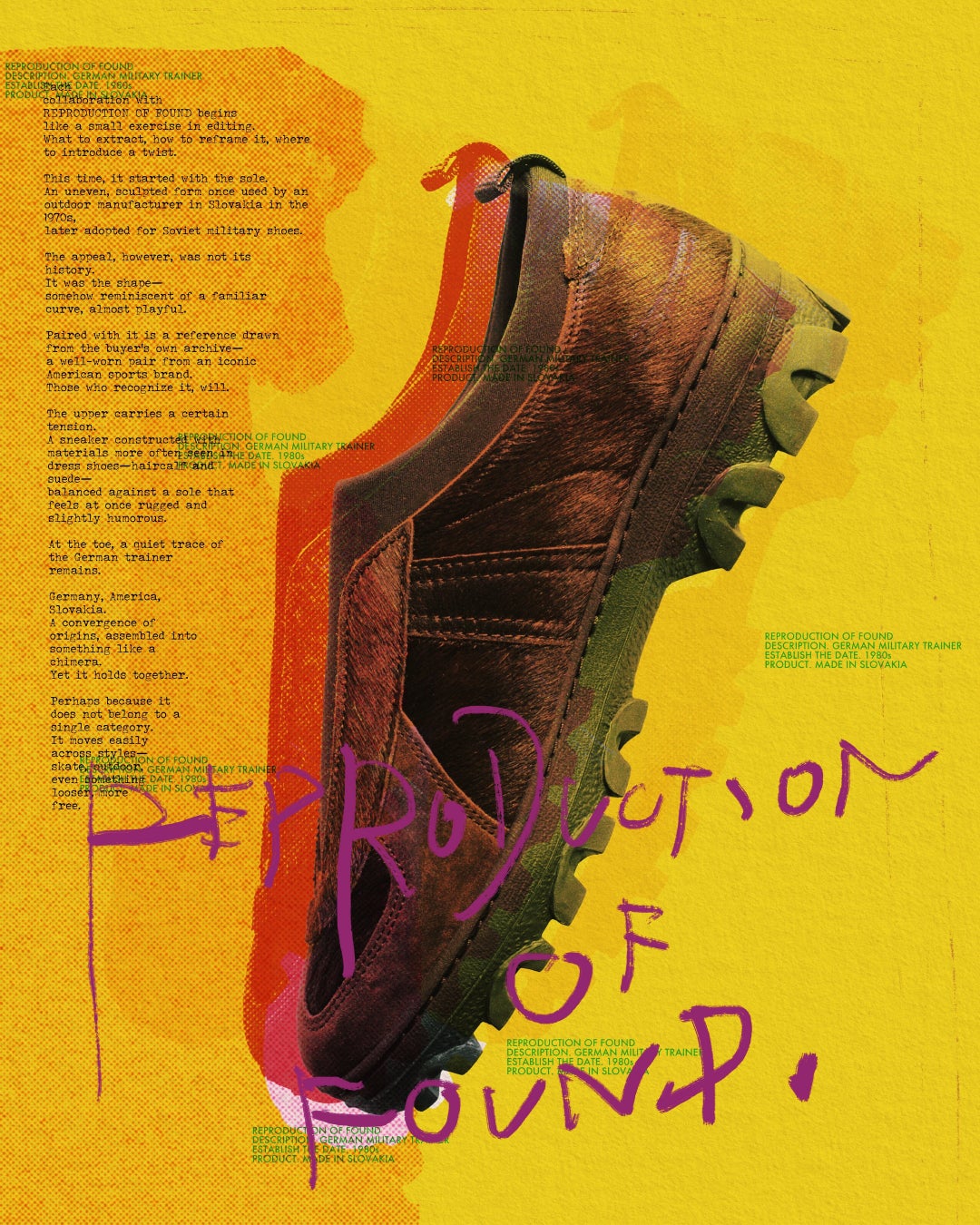 L'ECHOPPEがREPRODUCTION OF FOUNDとのコラボレーションで、スロバキアのアウトドアシューズの独特なソールとアメリカンスポーツシューズを融合させたスニーカー「GERMAN MILITARY TRAINER」を4月18日に発売。ハラコやスウェードなどの上質素材を使用し、ミリタリー、スポーツ、ドレスの要素を自然に融合させた一足。